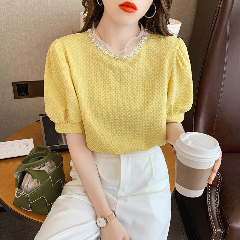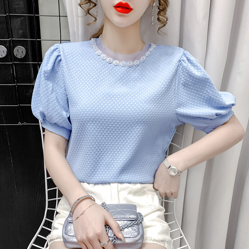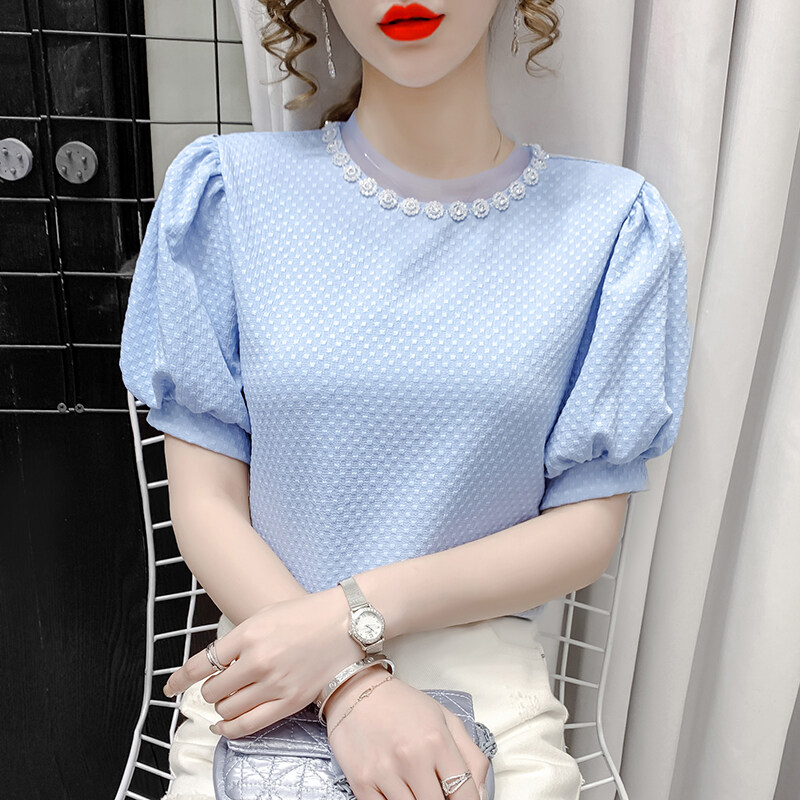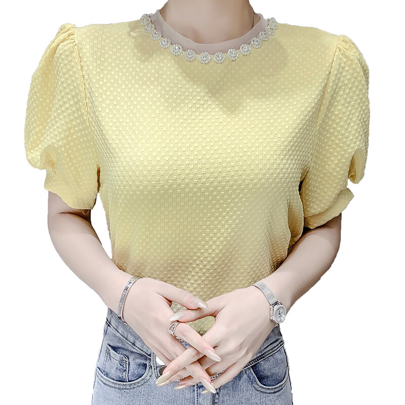 AIYIKU Mesh beaded round neck chiffon blouse women's 2023 summer new Korean version fashion solid color women's T-shirt