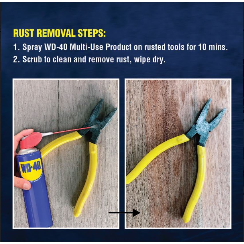 WD-40® Multi-Use Product protects metal from rust and corrosion, penetrates stuck parts, displaces moisture and lubricates almost anything. It even removes grease, grime and more from most surfaces.