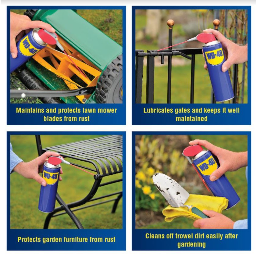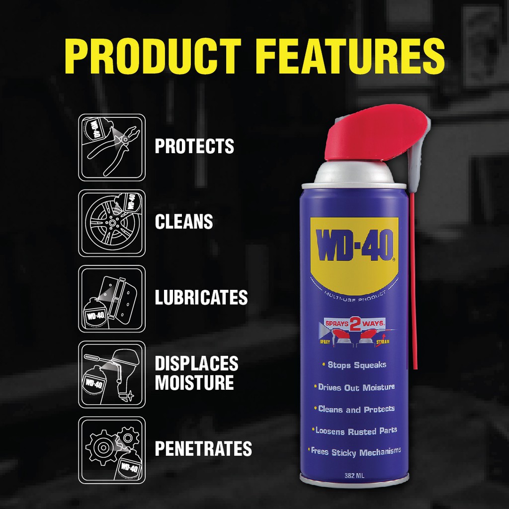 WD-40® Multi-Use Product lubricates moving parts such as hinges, wheels, rollers, chains and gears. It protects against rust and corrosion on items like tools and sporting equipment. It penetrates to free stuck corroded parts like nuts, bolts, valves and locks. It quickly removes adhesives, corrosion and paint. It displaces moisture to restore water flooded equipment such as engines, spark plugs and power tools.