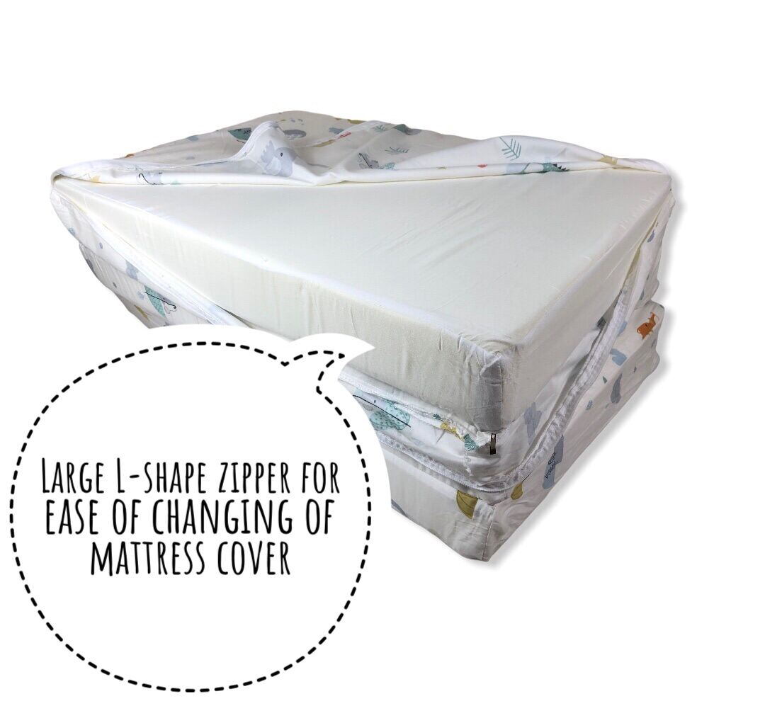 Specially curated with the comfort of your toddler in mind, the kids foldable mattress offers a firm 3 inch foam material fitted with a 100% cotton cute prints to ensure a breathable and comfy touch material for kids. The foam material is made of high density foam material to ensure a firm and comfortable sleep. Each individual foam is also fitted with an additional layer of inner fabric to provide additional comfort. The L-shaped design mattress cover allows you to change and wash the outer mattress cover at ease!