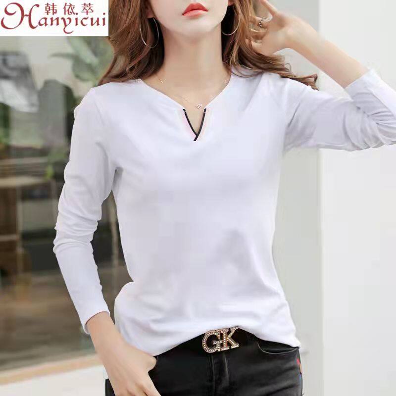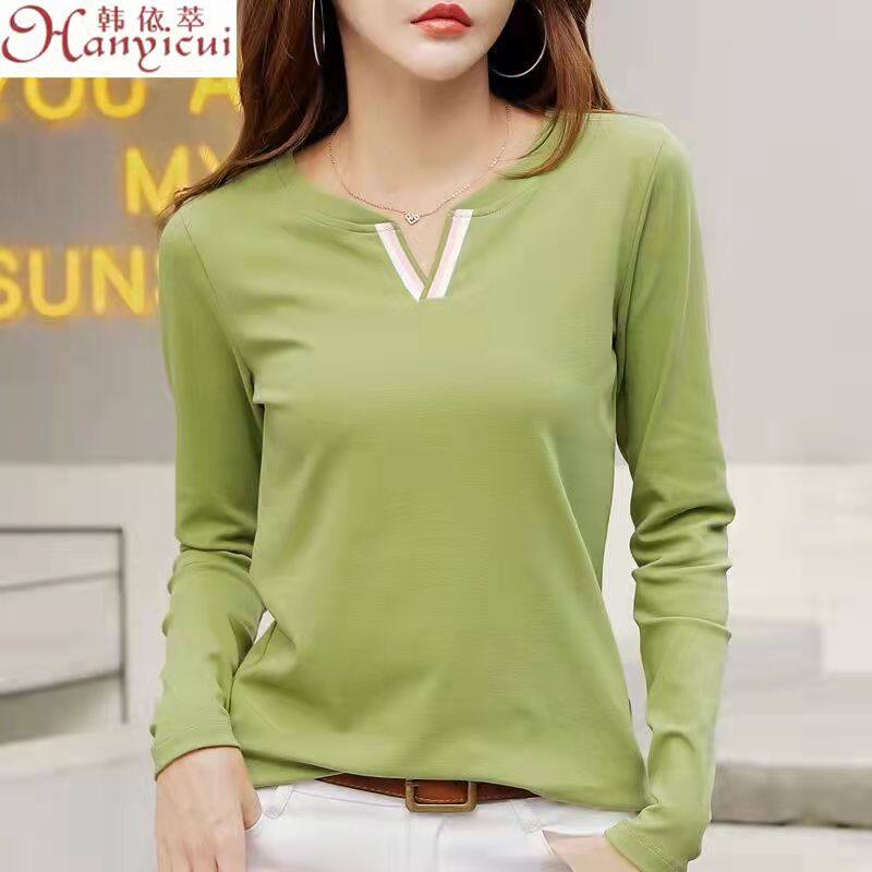 100% Cotton New Long Sleeve T-shirt for Women Loose V Neck Korean Basic Plain bottoming Shirts Blue Plus Size Tops Female Fashion Casual t shirt Free Shipping