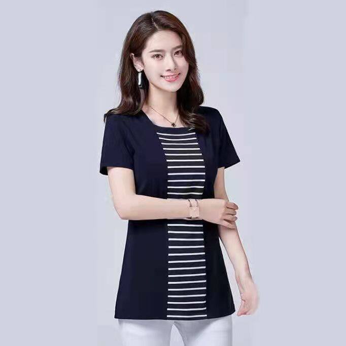 100KG Fat Female Can Wear 2022 New Korean Stripe Long T shirt Women Short Sleeve Plus Size Cover belly round neck fashion t-shirt dress elegant blouse women Tees