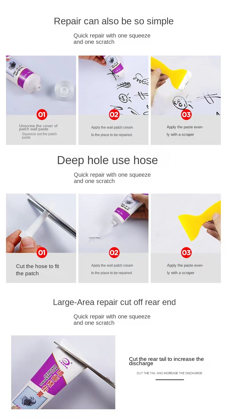 Scope of application: used to repair white wall damage, cracks, scratches, hollowing, peeling, nail holes, cracks and other wall problems