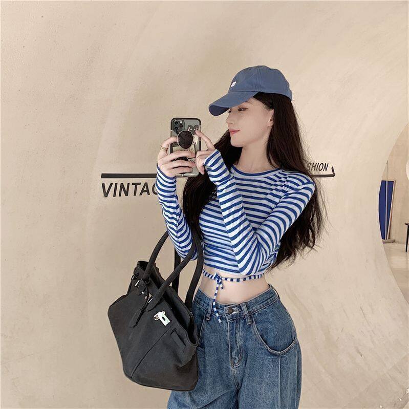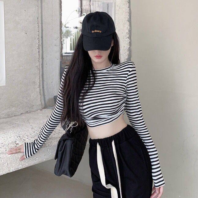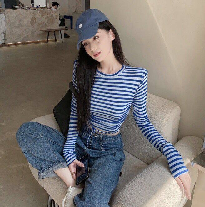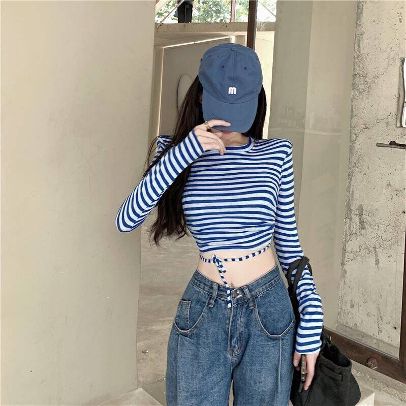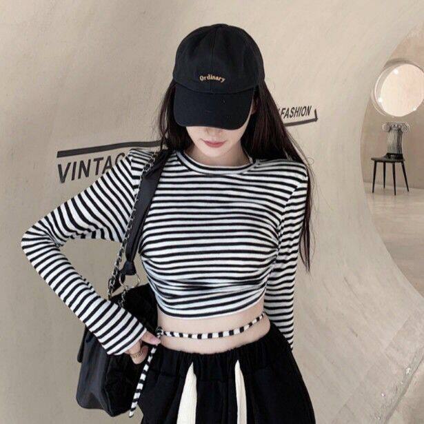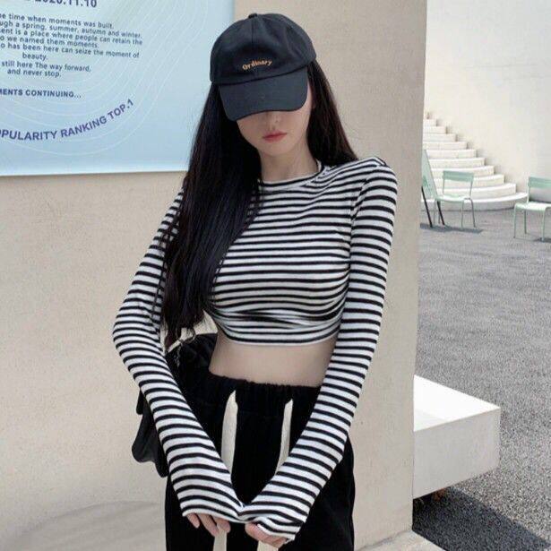 Striped T-shirt long sleeve color bump short style top